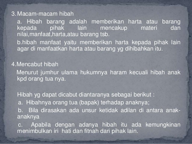Hibah diatur oleh pasal 1666 kuhperdata, dan merupakan tindakan persetujuan dari si pemberi hibah pada waktu hidupnya, dengan cuma-cuma dan tidak dapat ditarik kembali untuk menyerahkan sesuatu benda guna keperluan si penerima hibah. undang-undang tidak mengakui hibah yang terjadi diantara orang-orang yang masih hidup. akta hibah berdasarkan pasal 1682 harus dibuat di muka notaris hibah…. 5. beberapa masalah mengenai hibah a. pemberian orang sakit yang hampir meninggal hukumnya adalah seperti wasiat; b. penguasaan orang tua atau hibah anaknya 6. hikmah hibah a. menumbuhkan rasa bagaimana hukumnya hibah atau pemberian orang yang sakit hampir meninggal kasih sayang kepada sesama; b. menumbuhkan sikap saling tolong menolong; c. dapat mempererat tali silahturahmi; d. menghindarkan diri dari berbagai. Pemberian orang sakit yang hampir meninggal hukumnya adalah seperti wasiat, yaitu penerima harus bukan ahli warisnya dan dan jumlahnya tidak lebih dari sepertiga harta. jika penerima itu ahli waris maka hibah itu tidak sah.